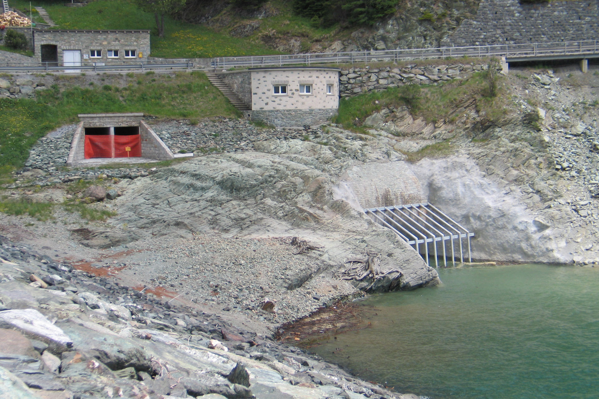 Erneuerung des Felssicherungsspritzbetons bei den seitlichen Einschnitte. Instandsetzung der Betonsohle. Montage eines Grobrechen aus Stahl als Verklausungsschutz des Zwischenablasses.